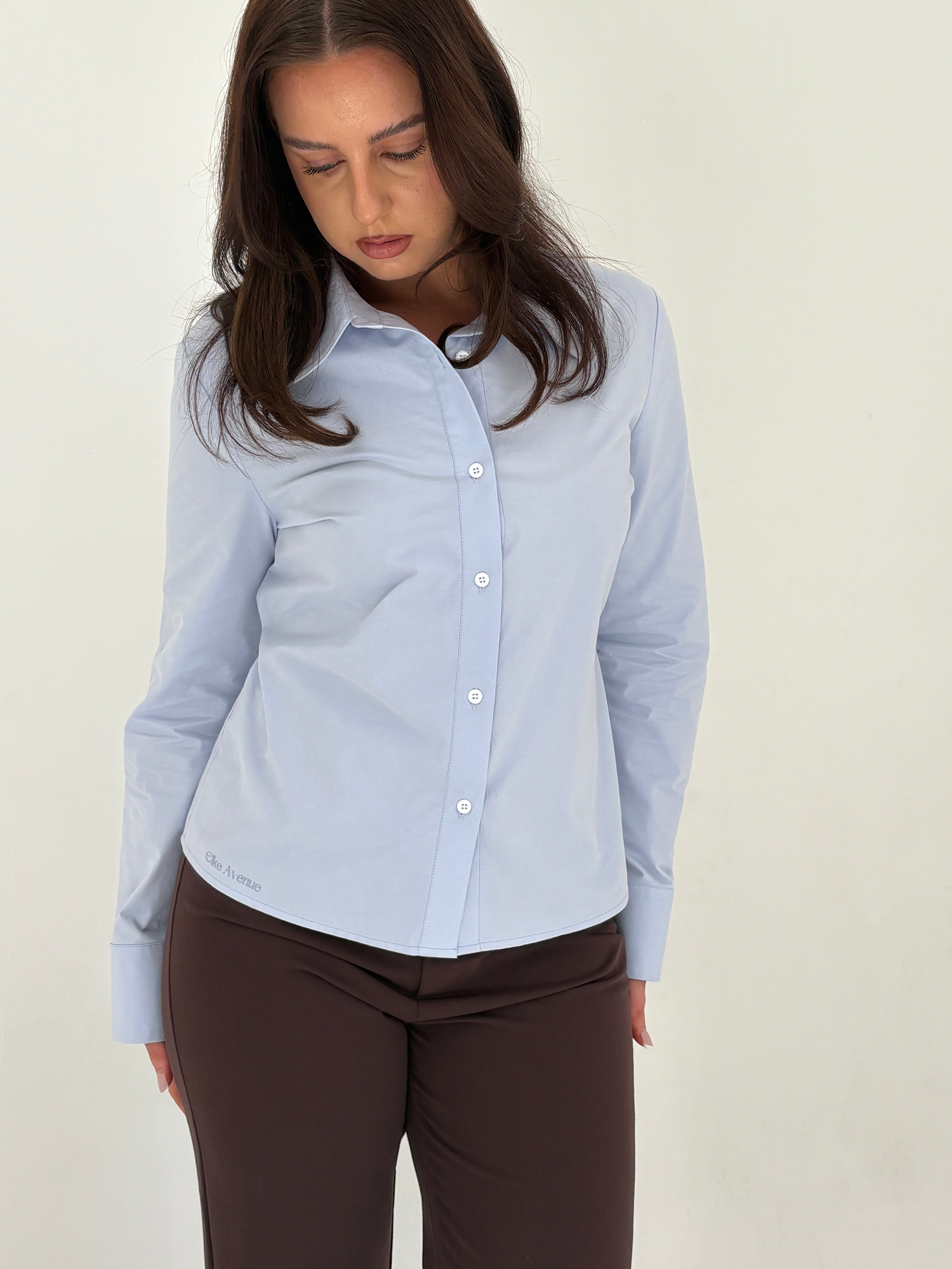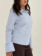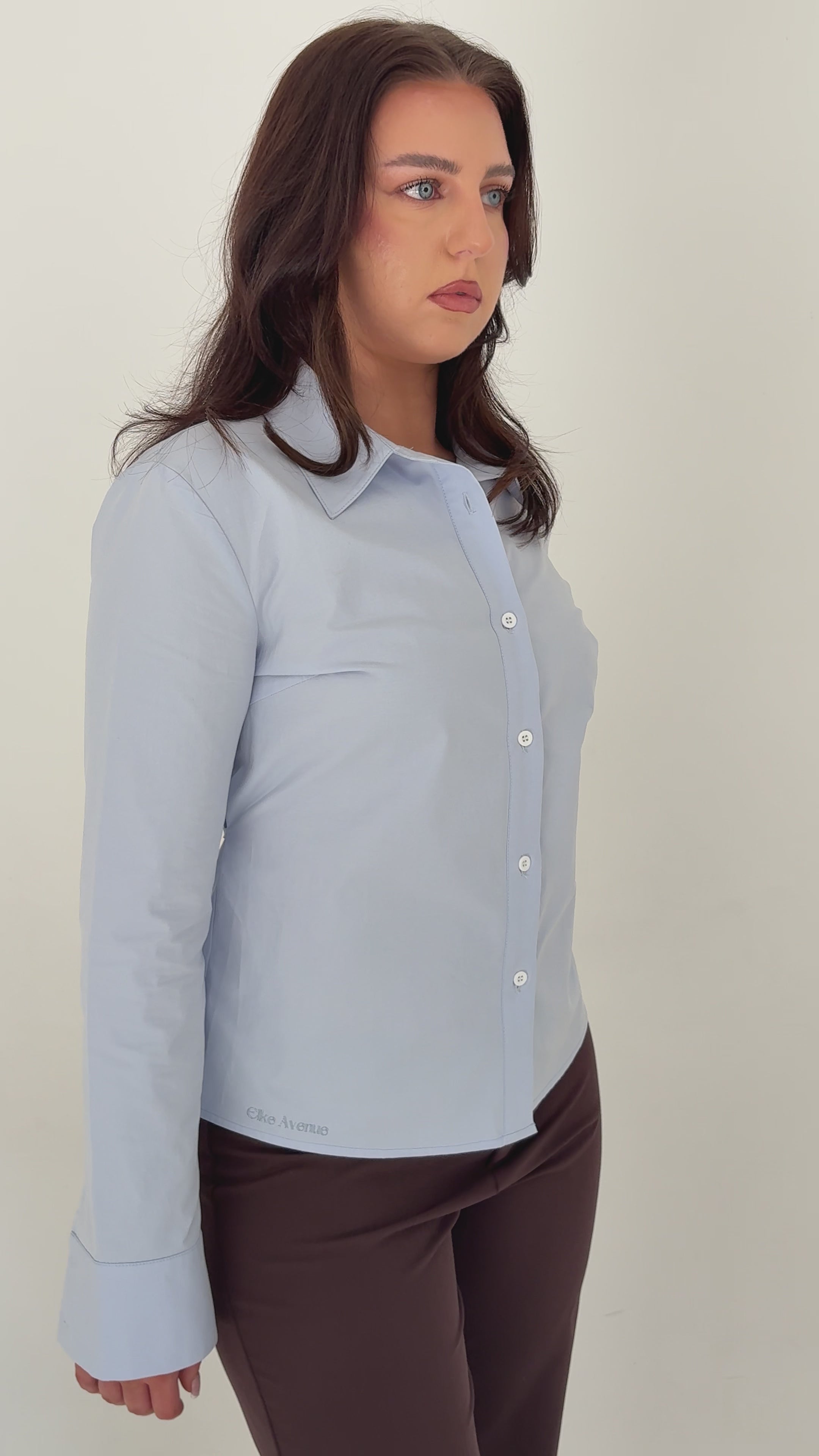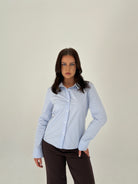 The Amélie Shirt is crafted from 100% soft cotton and features long sleeves with wide, refined cuffs. A subtle back tie cinch allows for a customisable fit, while a minimal embroidered logo in the bottom corner adds a quiet finishing touch