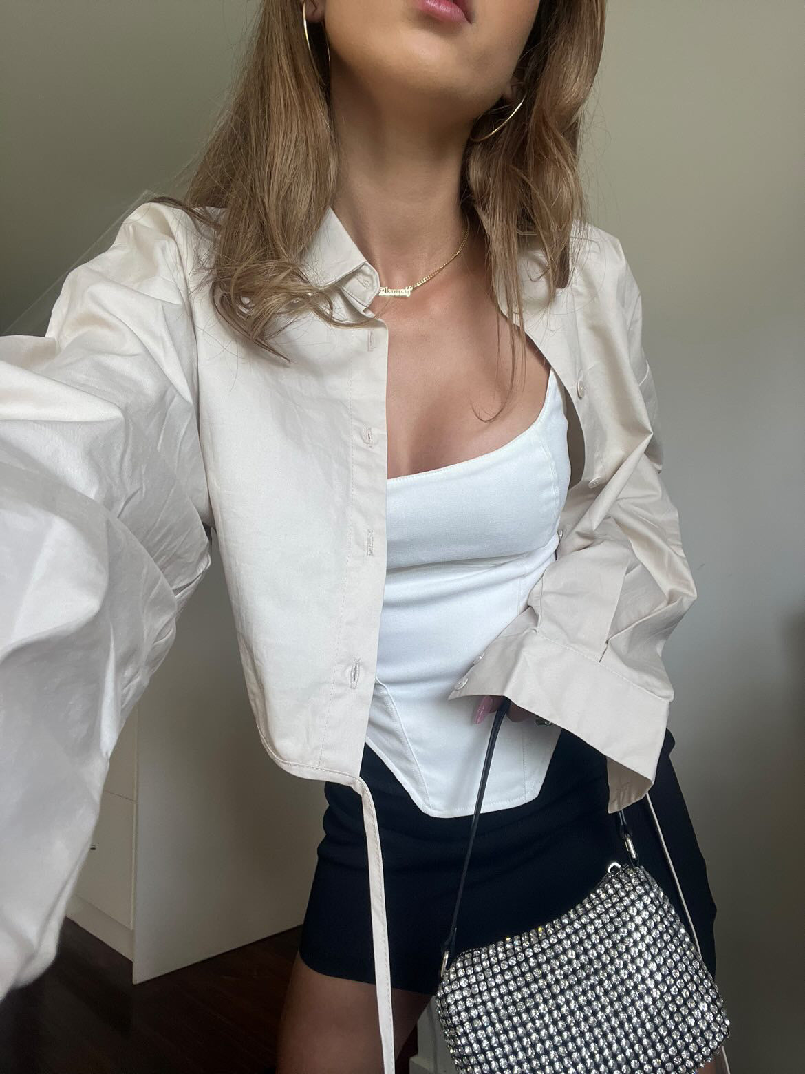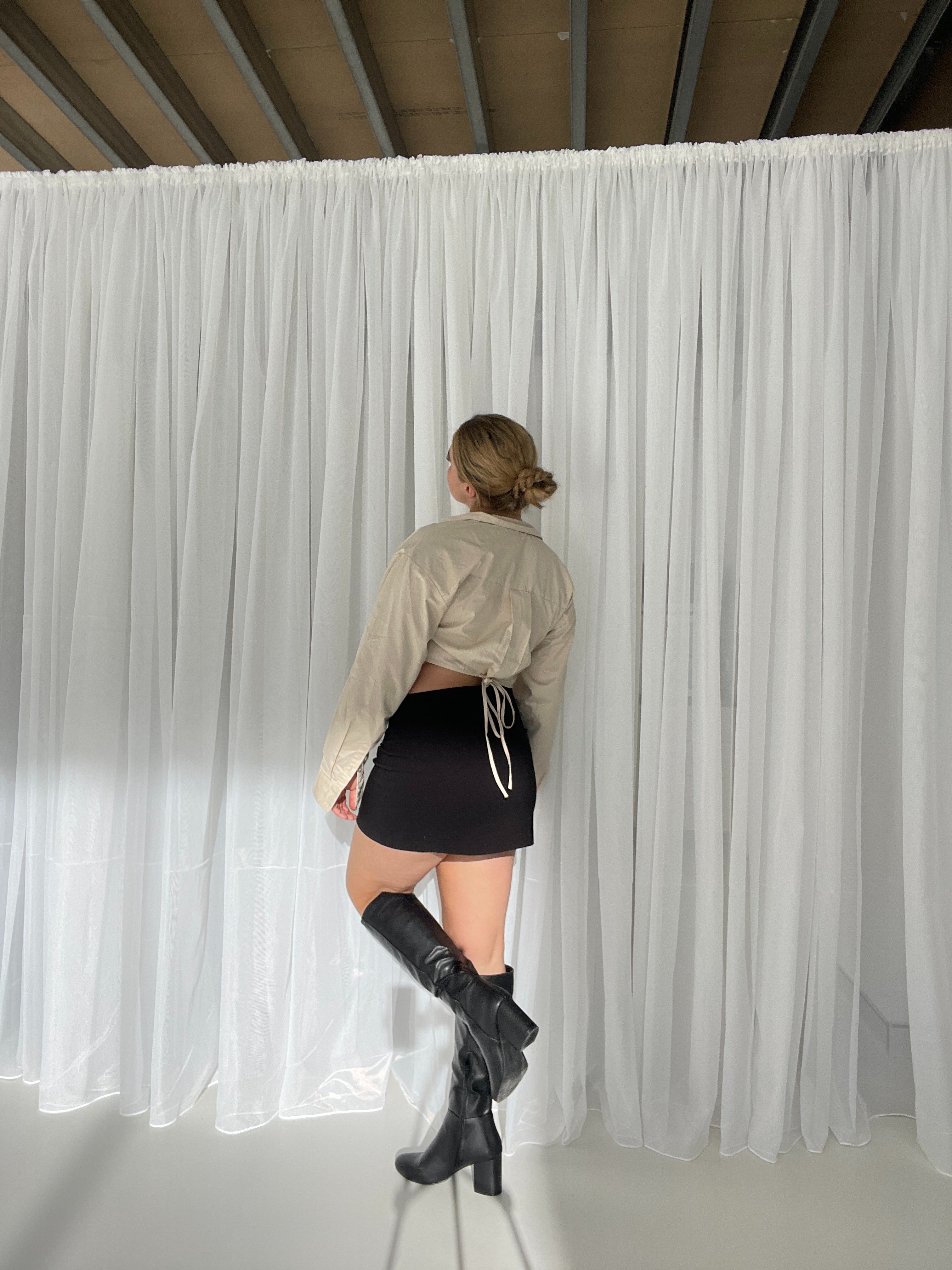 The Must Have Crop- Beige is perfect for those looking to stay stylish and comfortable. It features a cropped style with long sleeve design and buttons down the middle for secure fit. It also features long straps that can be tied at the bottom for a customized fit.